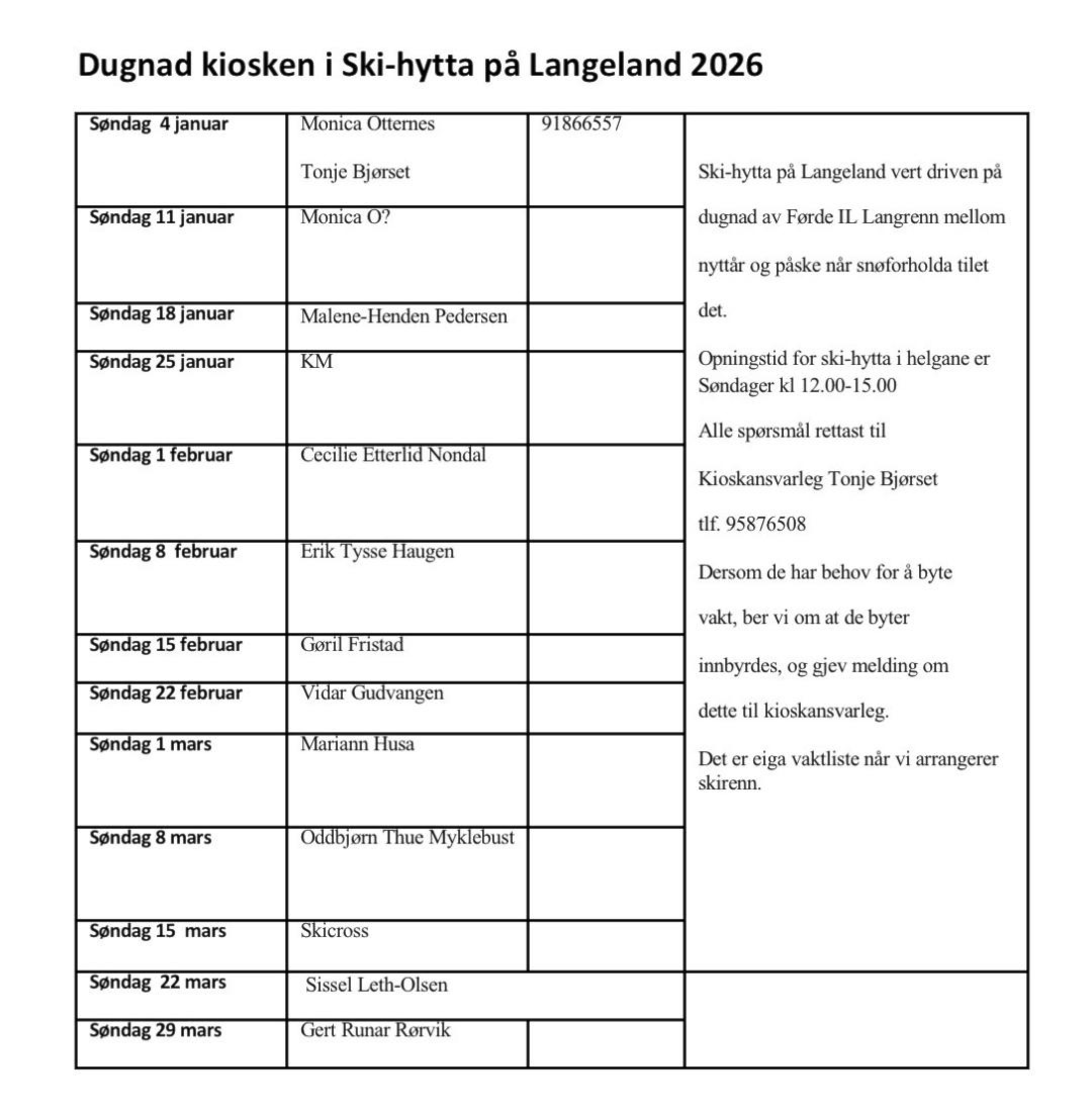 Dugnadslister Kiosk Søndager 2026: